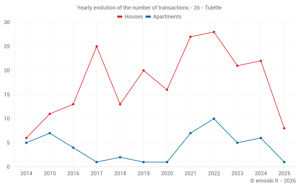 The median price on the 21 house transactions of the last 12 months in the municipality of Tulette was 2 118 € per square meter for a median property value of 167 500 €. Over this period, 60% of transactions were between 1 579 and 2 697 € per square meter (from the 2nd to the 8th deciles).
