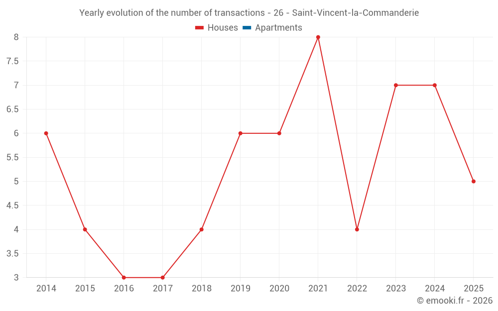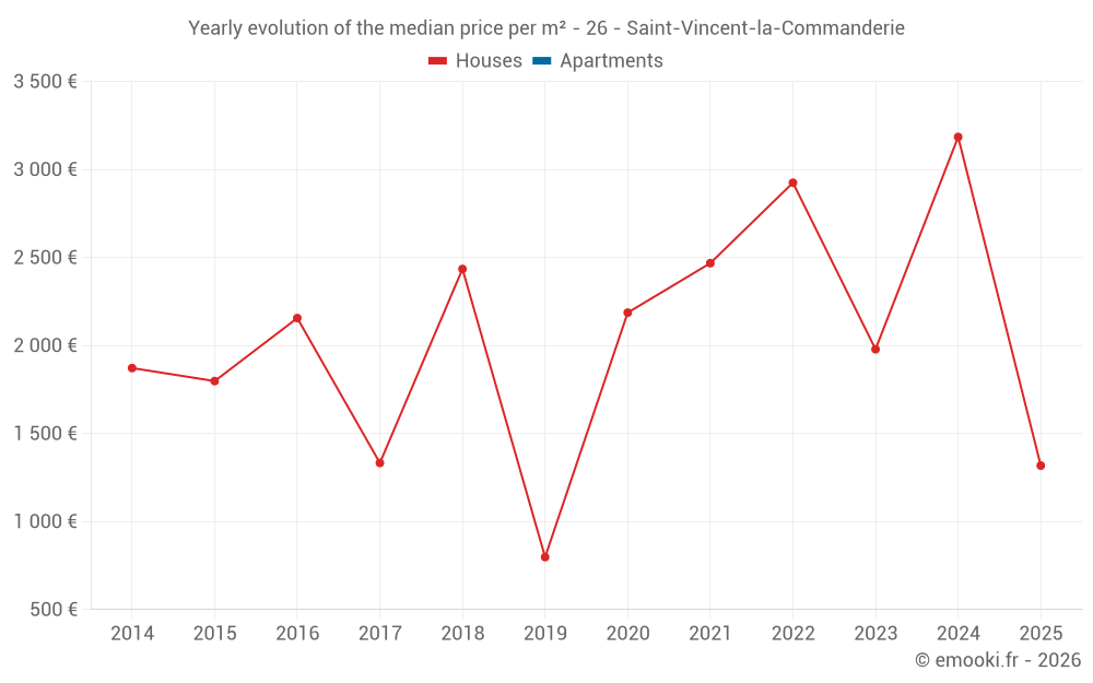 The median price on the 16 house transactions of the last 24 months in the municipality of Saint-Vincent-la-Commanderie was 2 117 € per square meter for a median property value of 195 000 €. Over this period, 60% of transactions were between 1 318 and 3 199 € per square meter (from the 2nd to the 8th deciles).