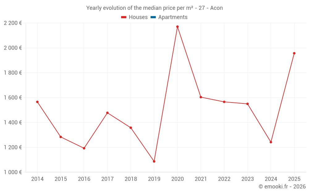 The median price on the 19 house transactions of the last 24 months in the municipality of Acon was 1 525 € per square meter for a median property value of 155 500 €. Over this period, 60% of transactions were between 740 and 2 003 € per square meter (from the 2nd to the 8th deciles).