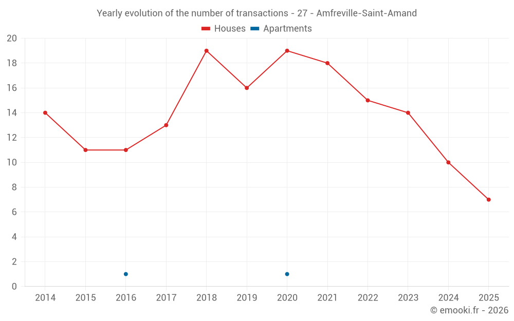 The median price on the 20 house transactions of the last 24 months in the municipality of Amfreville-Saint-Amand was 1 966 € per square meter for a median property value of 168 500 €. Over this period, 60% of transactions were between 1 437 and 2 123 € per square meter (from the 2nd to the 8th deciles).