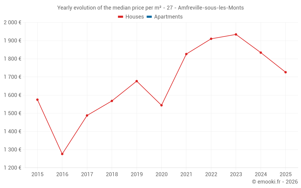 The median price on the 15 house transactions of the last 24 months in the municipality of Amfreville-sous-les-Monts was 1 978 € per square meter for a median property value of 170 000 €. Over this period, 60% of transactions were between 1 361 and 2 322 € per square meter (from the 2nd to the 8th deciles).