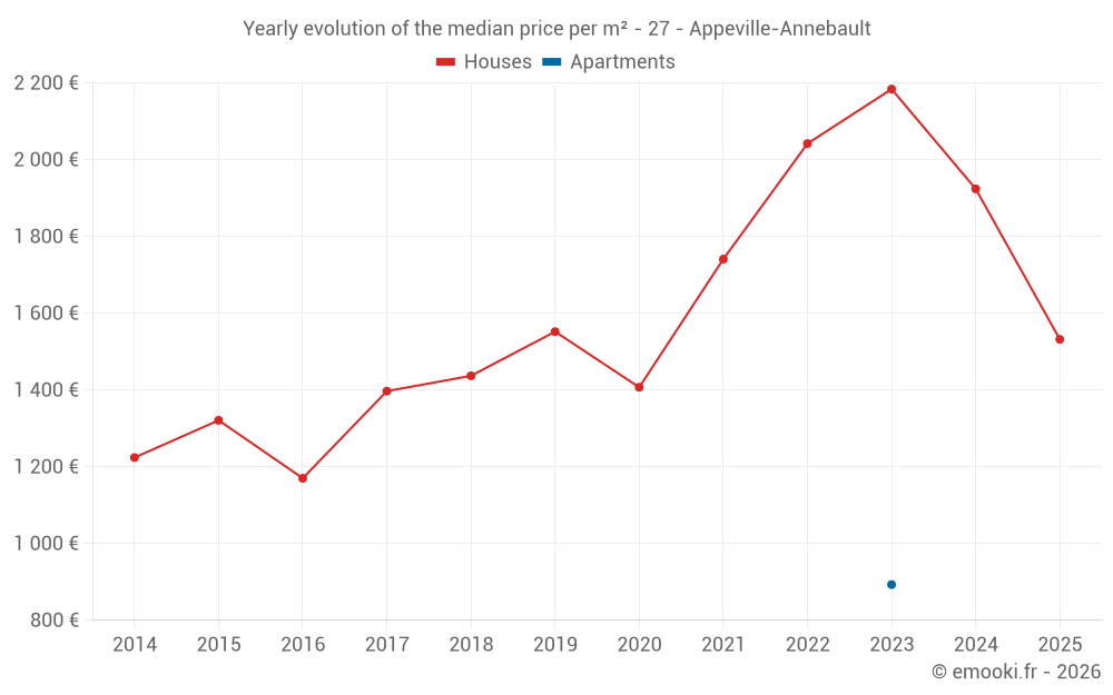 The median price on the 23 house transactions of the last 24 months in the municipality of Appeville-Annebault was 1 822 € per square meter for a median property value of 172 100 €. Over this period, 60% of transactions were between 1 377 and 2 220 € per square meter (from the 2nd to the 8th deciles).