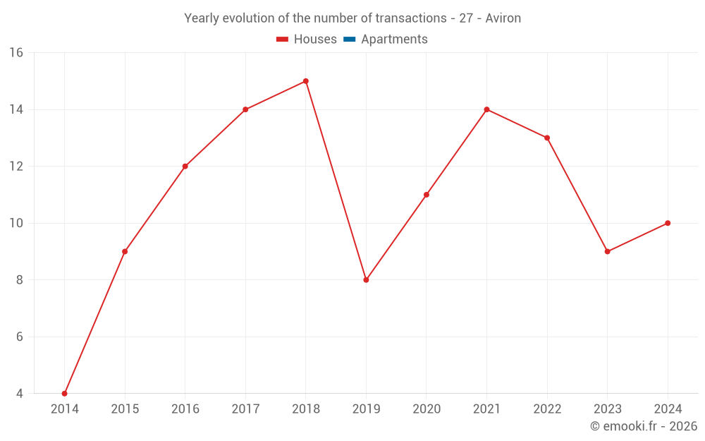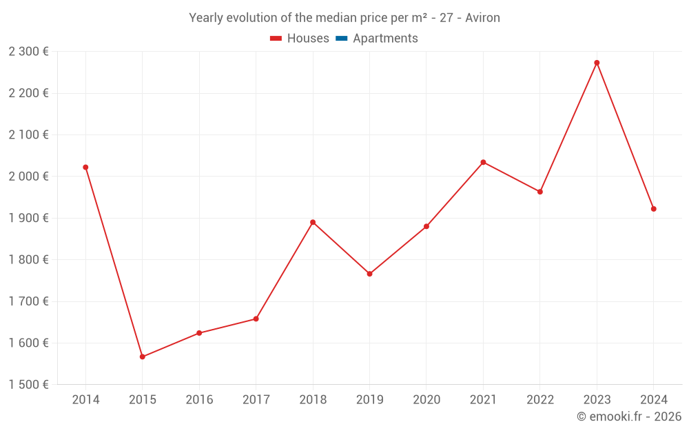 The median price on the 15 house transactions of the last 24 months in the municipality of Aviron was 2 213 € per square meter for a median property value of 200 000 €. Over this period, 60% of transactions were between 1 864 and 2 497 € per square meter (from the 2nd to the 8th deciles).