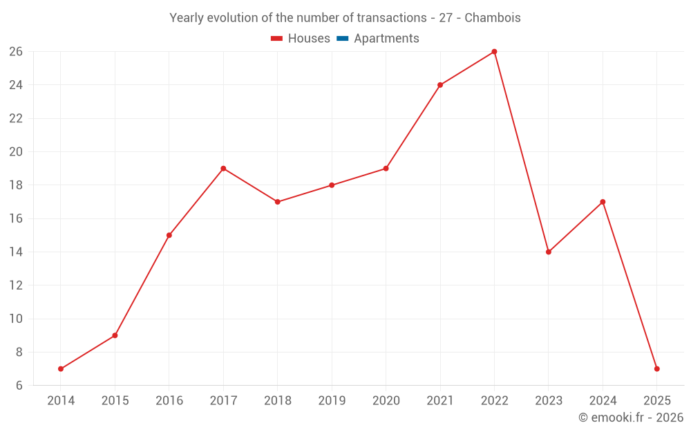 The median price on the 17 house transactions of the last 12 months in the municipality of Chambois was 1 639 € per square meter for a median property value of 200 000 €. Over this period, 60% of transactions were between 1 459 and 2 110 € per square meter (from the 2nd to the 8th deciles).