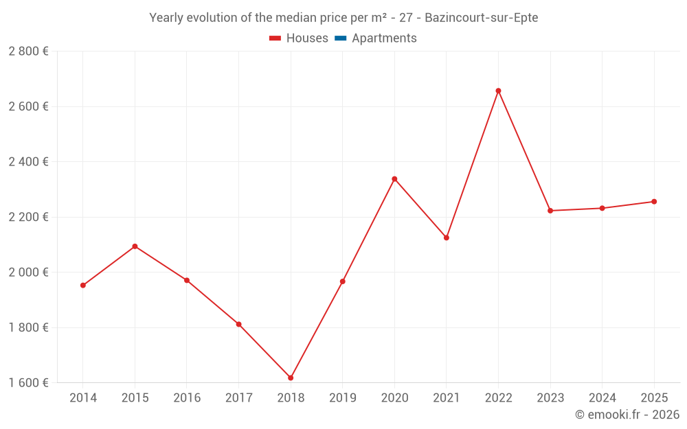The median price on the 17 house transactions of the last 24 months in the municipality of Bazincourt-sur-Epte was 2 286 € per square meter for a median property value of 239 500 €. Over this period, 60% of transactions were between 1 853 and 2 631 € per square meter (from the 2nd to the 8th deciles).