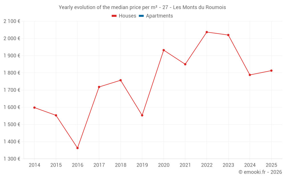 The median price on the 29 house transactions of the last 24 months in the municipality of Les Monts du Roumois was 1 908 € per square meter for a median property value of 185 000 €. Over this period, 60% of transactions were between 1 023 and 2 360 € per square meter (from the 2nd to the 8th deciles).