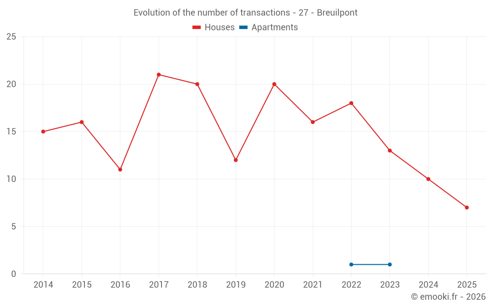 The median price on the 25 house transactions of the last 24 months in the municipality of Breuilpont was 2 203 € per square meter for a median property value of 240 000 €. Over this period, 60% of transactions were between 1 712 and 2 498 € per square meter (from the 2nd to the 8th deciles).