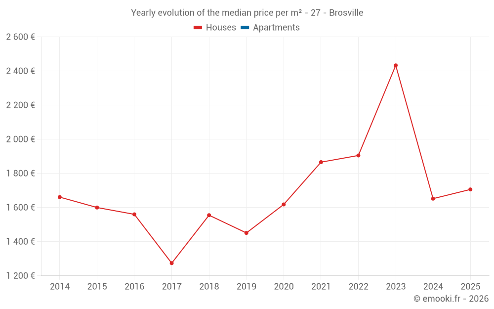 The median price on the 16 house transactions of the last 24 months in the municipality of Brosville was 1 698 € per square meter for a median property value of 195 450 €. Over this period, 60% of transactions were between 1 600 and 2 088 € per square meter (from the 2nd to the 8th deciles).