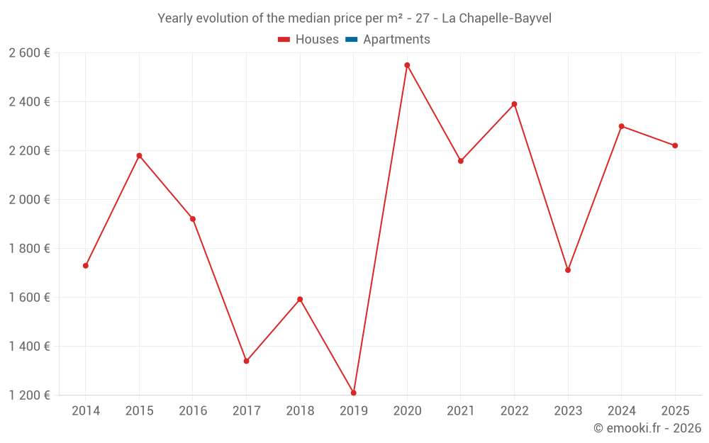 The median price on the 14 house transactions of the last 24 months in the municipality of La Chapelle-Bayvel was 2 209 € per square meter for a median property value of 212 450 €. Over this period, 60% of transactions were between 1 870 and 2 399 € per square meter (from the 2nd to the 8th deciles).
