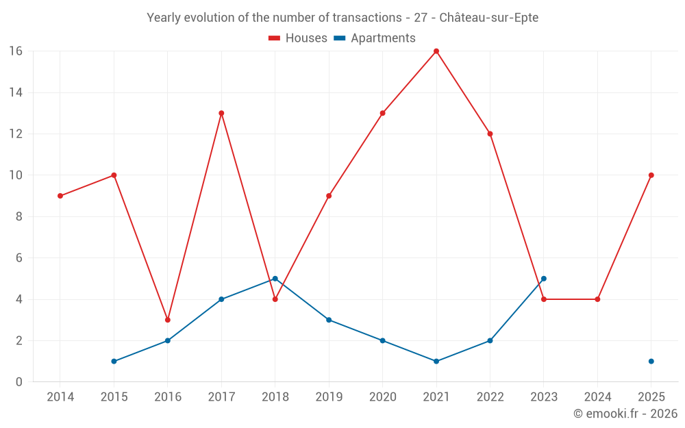 The median price on the 14 house transactions of the last 24 months in the municipality of Château-sur-Epte was 2 106 € per square meter for a median property value of 181 250 €. Over this period, 60% of transactions were between 1 299 and 2 660 € per square meter (from the 2nd to the 8th deciles).