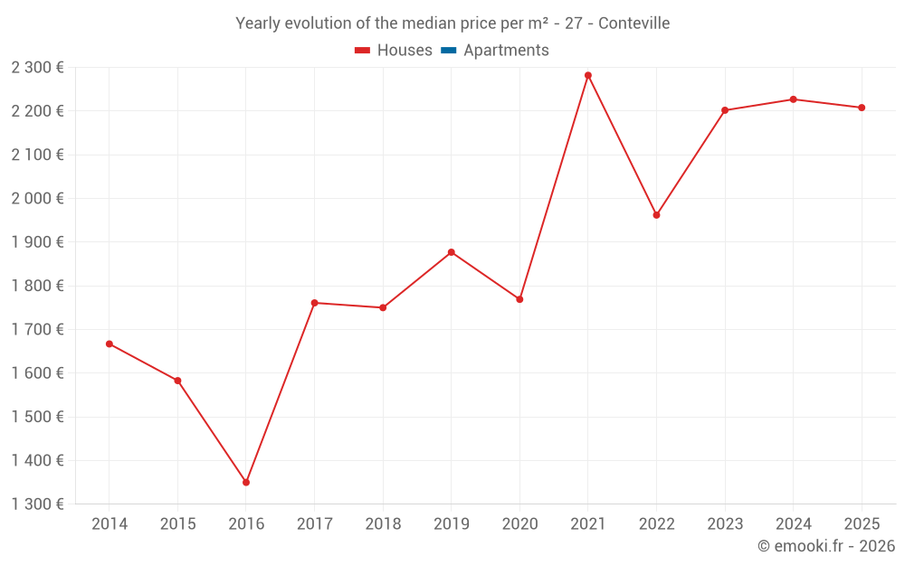 The median price on the 16 house transactions of the last 12 months in the municipality of Conteville was 2 218 € per square meter for a median property value of 231 217 €. Over this period, 60% of transactions were between 1 538 and 2 424 € per square meter (from the 2nd to the 8th deciles).