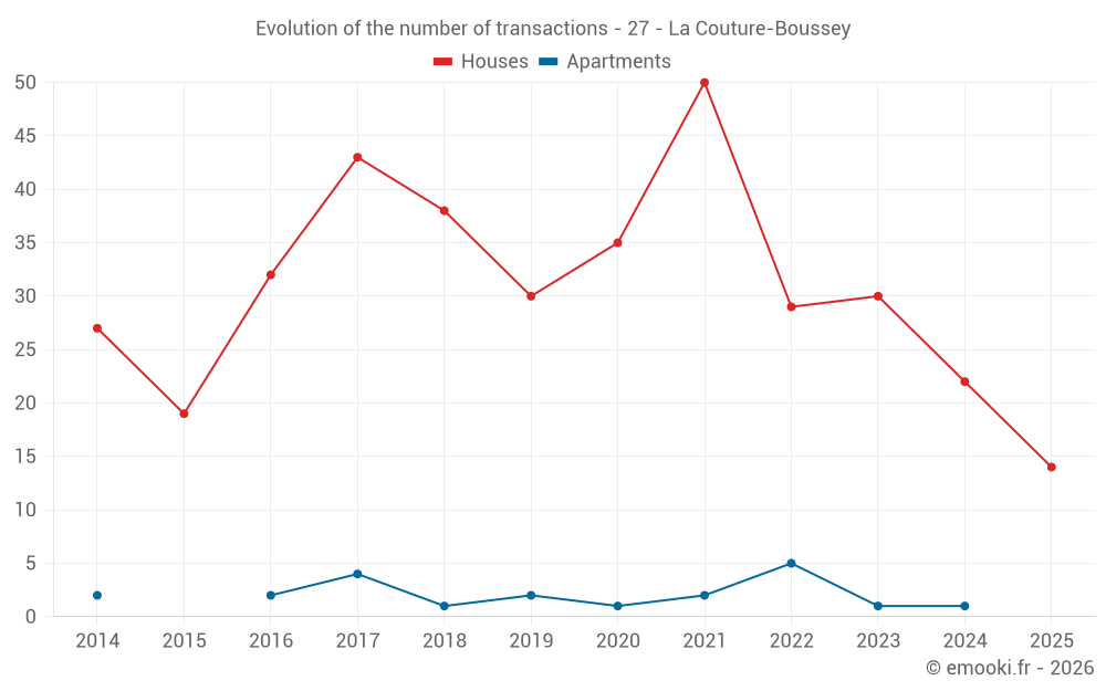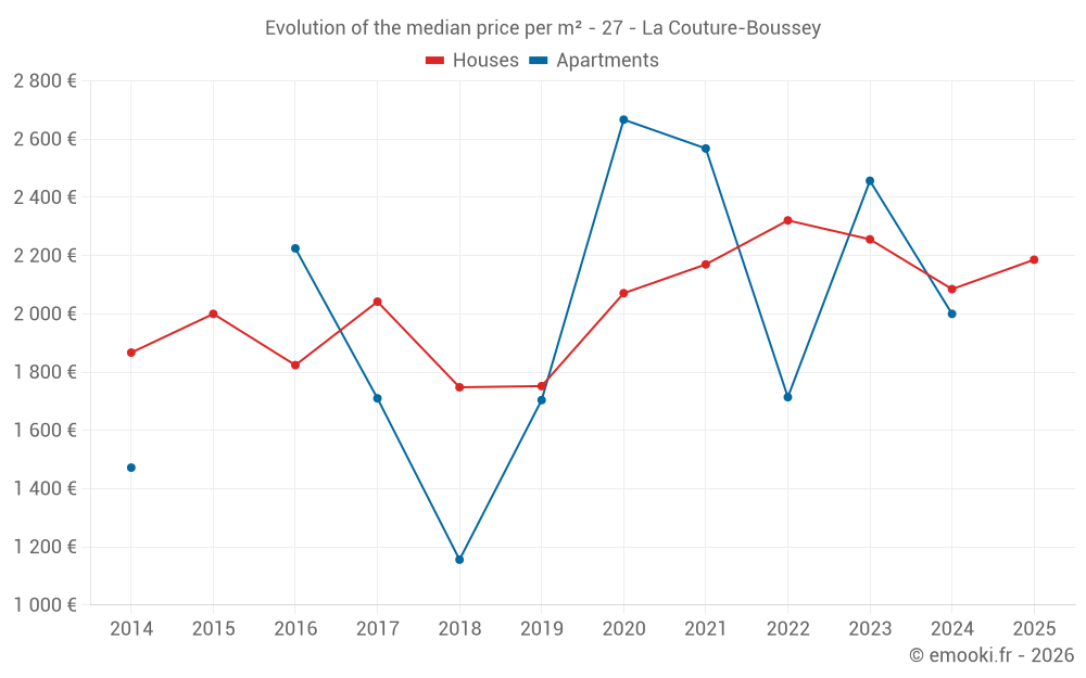 The median price on the 22 house transactions of the last 12 months in the municipality of La Couture-Boussey was 2 186 € per square meter for a median property value of 169 000 €. Over this period, 60% of transactions were between 1 342 and 2 561 € per square meter (from the 2nd to the 8th deciles).