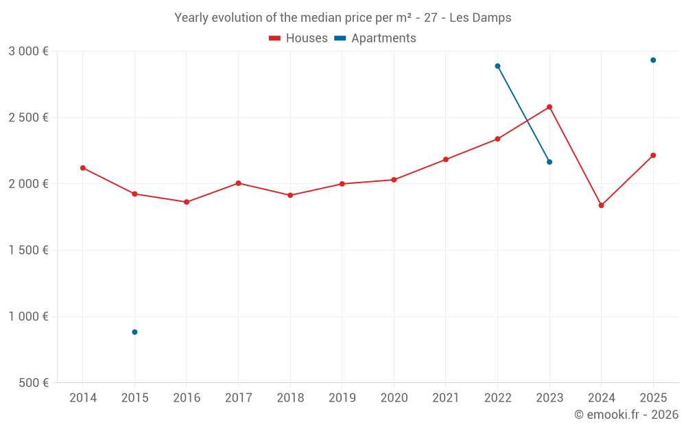 The median price on the 20 house transactions of the last 24 months in the municipality of Les Damps was 2 128 € per square meter for a median property value of 181 950 €. Over this period, 60% of transactions were between 1 496 and 2 536 € per square meter (from the 2nd to the 8th deciles).