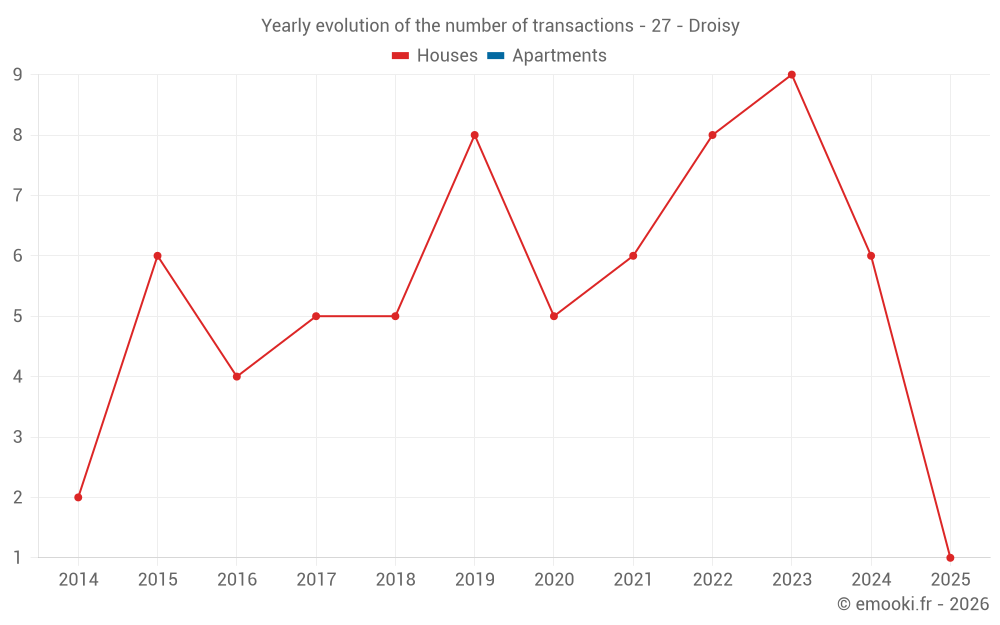 The median price on the 14 house transactions of the last 24 months in the municipality of Droisy was 1 768 € per square meter for a median property value of 171 500 €. Over this period, 60% of transactions were between 1 170 and 1 962 € per square meter (from the 2nd to the 8th deciles).
