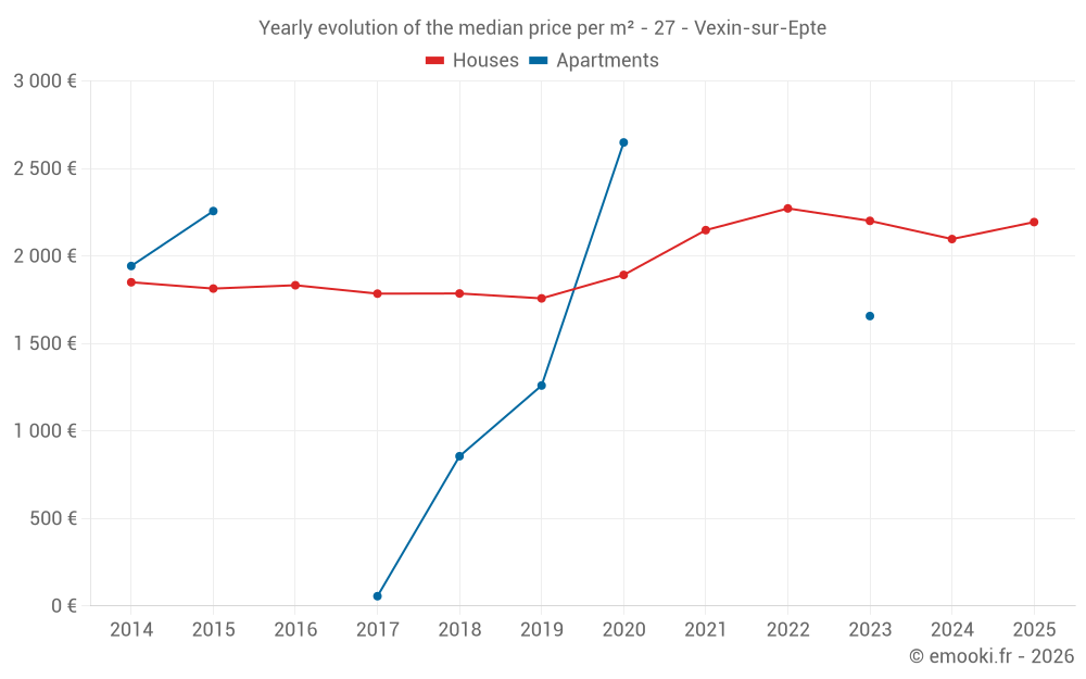 The median price on the 29 house transactions of the last 6 months in the municipality of Vexin-sur-Epte was 2 194 € per square meter for a median property value of 209 000 €. Over this period, 60% of transactions were between 1 260 and 2 852 € per square meter (from the 2nd to the 8th deciles).
