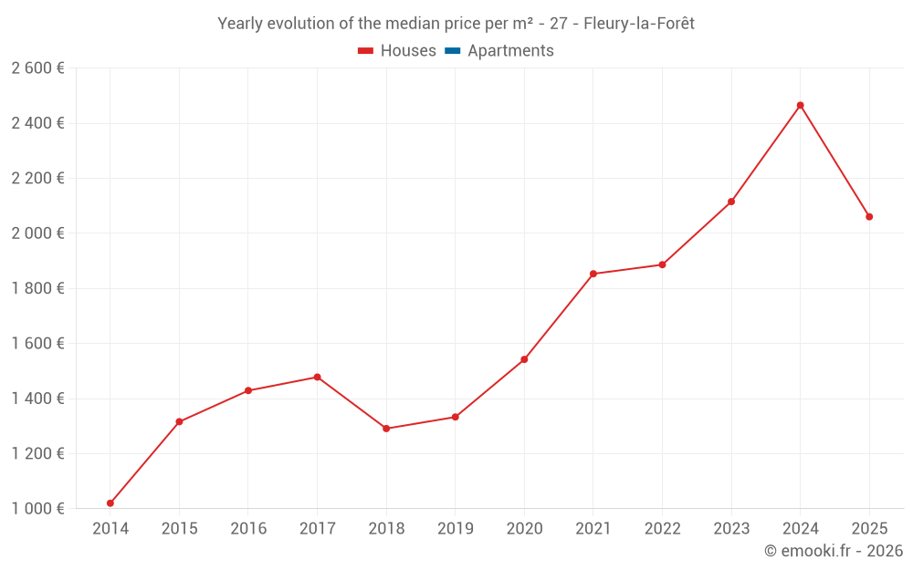 The median price on the 15 house transactions of the last 24 months in the municipality of Fleury-la-Forêt was 2 214 € per square meter for a median property value of 150 000 €. Over this period, 60% of transactions were between 1 793 and 2 617 € per square meter (from the 2nd to the 8th deciles).