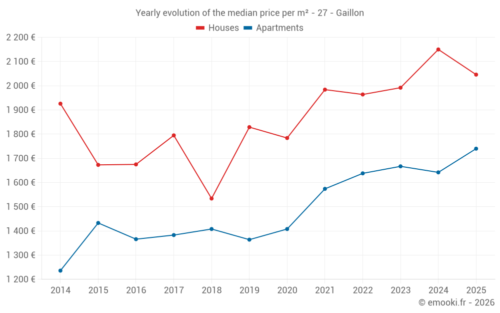 The median price on the 34 house transactions of the last 12 months in the municipality of Gaillon was 2 046 € per square meter for a median property value of 168 000 €. Over this period, 60% of transactions were between 1 563 and 2 432 € per square meter (from the 2nd to the 8th deciles).