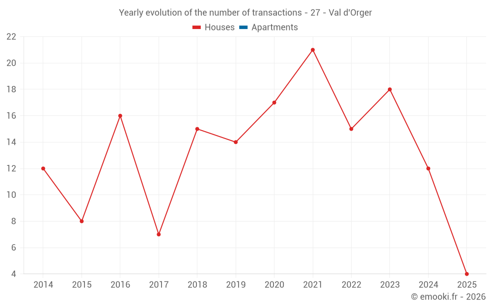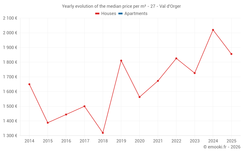 The median price on the 23 house transactions of the last 24 months in the municipality of Val d'Orger was 1 953 € per square meter for a median property value of 182 200 €. Over this period, 60% of transactions were between 1 231 and 2 144 € per square meter (from the 2nd to the 8th deciles).