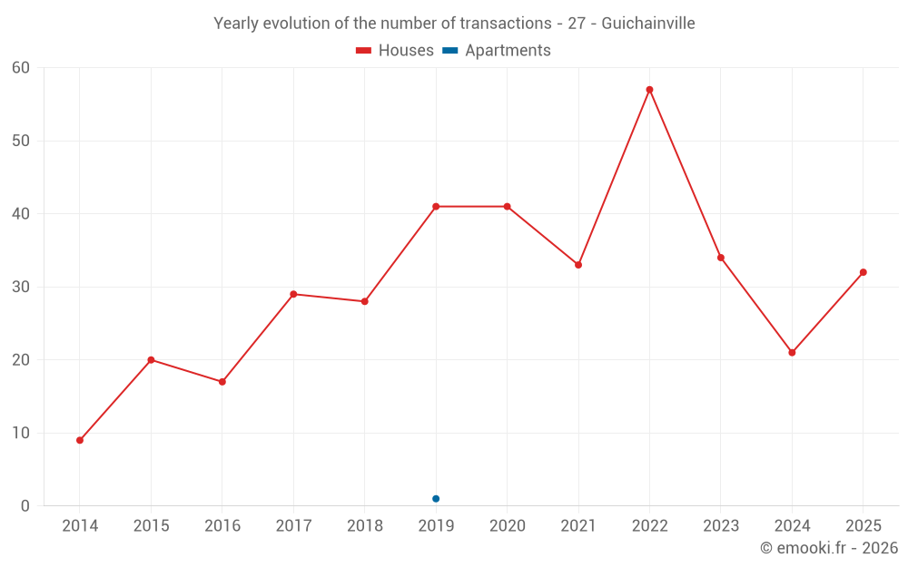 The median price on the 21 house transactions of the last 6 months in the municipality of Guichainville was 2 013 € per square meter for a median property value of 210 400 €. Over this period, 60% of transactions were between 1 737 and 2 499 € per square meter (from the 2nd to the 8th deciles).