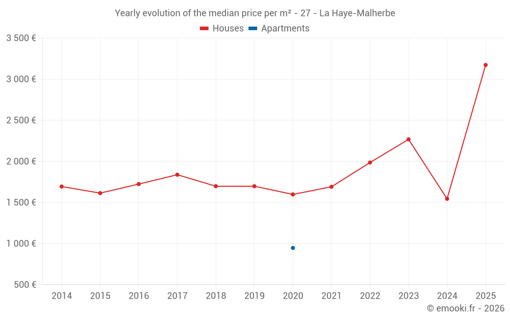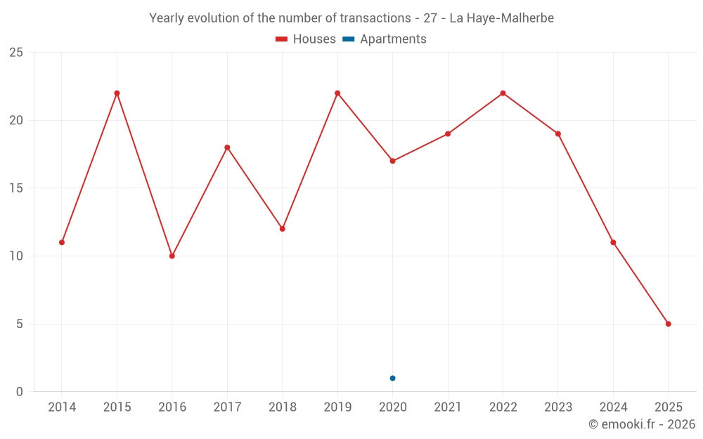 The median price on the 25 house transactions of the last 24 months in the municipality of La Haye-Malherbe was 1 778 € per square meter for a median property value of 160 000 €. Over this period, 60% of transactions were between 1 393 and 2 669 € per square meter (from the 2nd to the 8th deciles).
