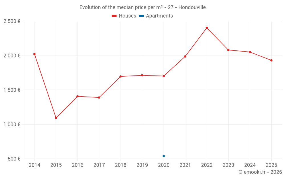The median price on the 23 house transactions of the last 24 months in the municipality of Hondouville was 1 874 € per square meter for a median property value of 178 000 €. Over this period, 60% of transactions were between 1 316 and 2 534 € per square meter (from the 2nd to the 8th deciles).