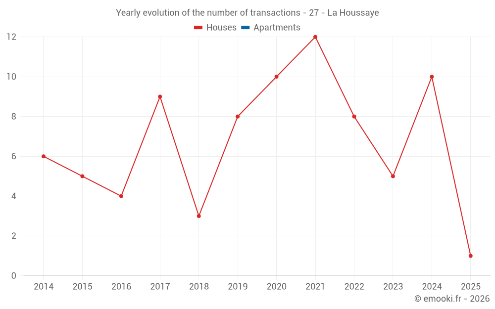 The median price on the 15 house transactions of the last 24 months in the municipality of La Houssaye was 1 594 € per square meter for a median property value of 180 200 €. Over this period, 60% of transactions were between 1 179 and 2 584 € per square meter (from the 2nd to the 8th deciles).