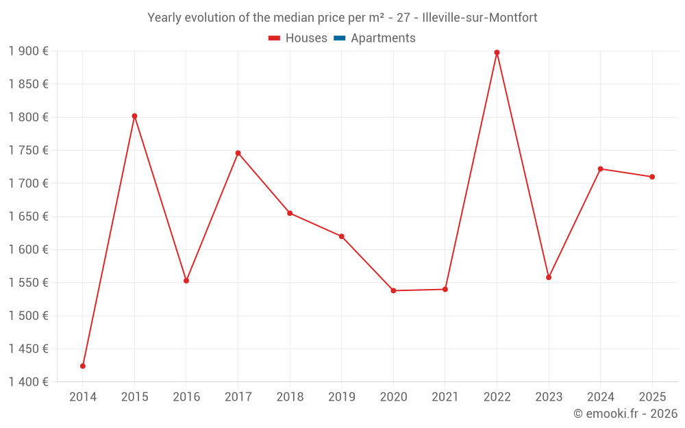 The median price on the 15 house transactions of the last 24 months in the municipality of Illeville-sur-Montfort was 1 628 € per square meter for a median property value of 190 000 €. Over this period, 60% of transactions were between 1 210 and 1 961 € per square meter (from the 2nd to the 8th deciles).