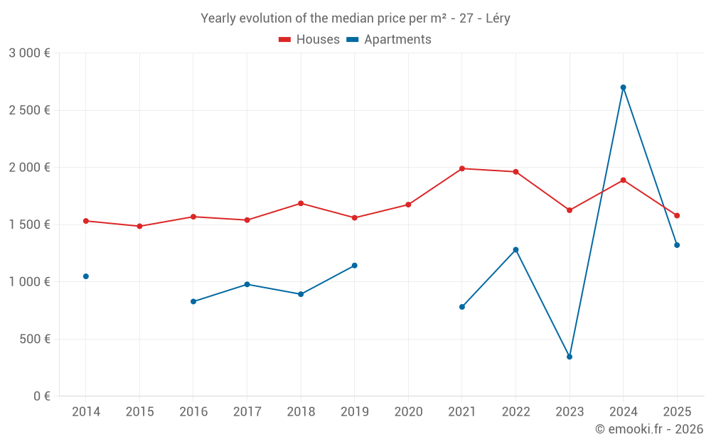 The median price on the 30 house transactions of the last 24 months in the municipality of Léry was 1 855 € per square meter for a median property value of 158 825 €. Over this period, 60% of transactions were between 1 428 and 2 216 € per square meter (from the 2nd to the 8th deciles).