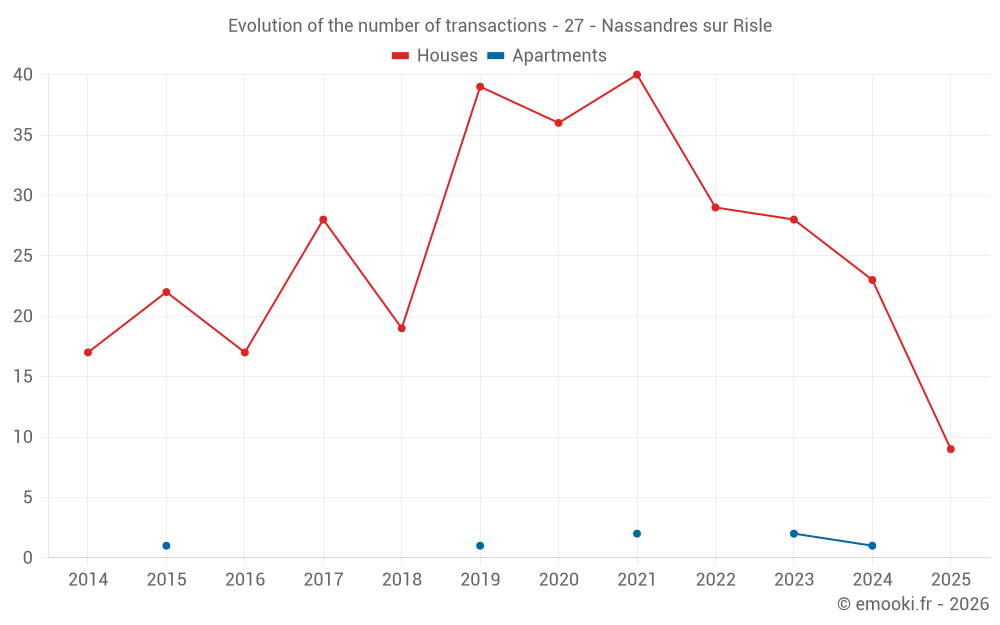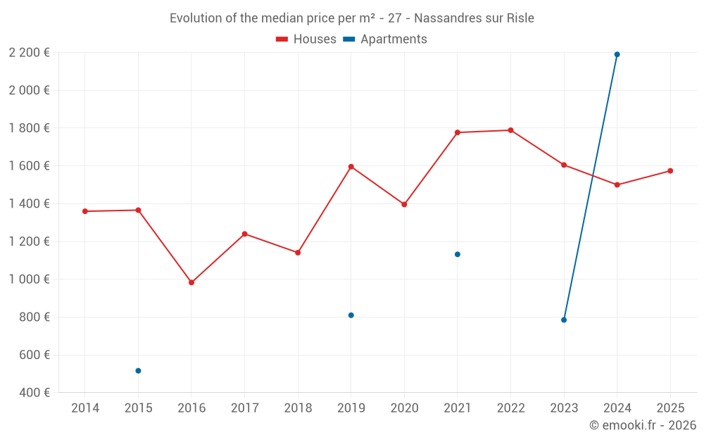 The median price on the 22 house transactions of the last 12 months in the municipality of Nassandres sur Risle was 1 492 € per square meter for a median property value of 132 650 €. Over this period, 60% of transactions were between 1 350 and 1 841 € per square meter (from the 2nd to the 8th deciles).