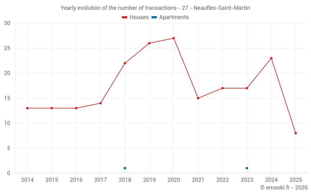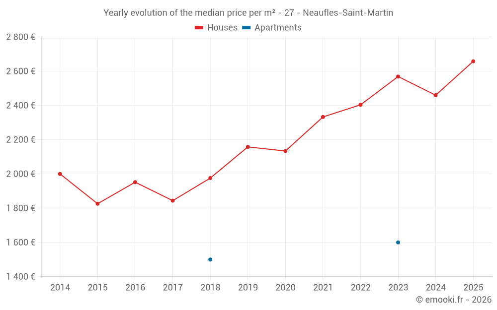 The median price on the 24 house transactions of the last 12 months in the municipality of Neaufles-Saint-Martin was 2 438 € per square meter for a median property value of 198 550 €. Over this period, 60% of transactions were between 1 704 and 2 895 € per square meter (from the 2nd to the 8th deciles).