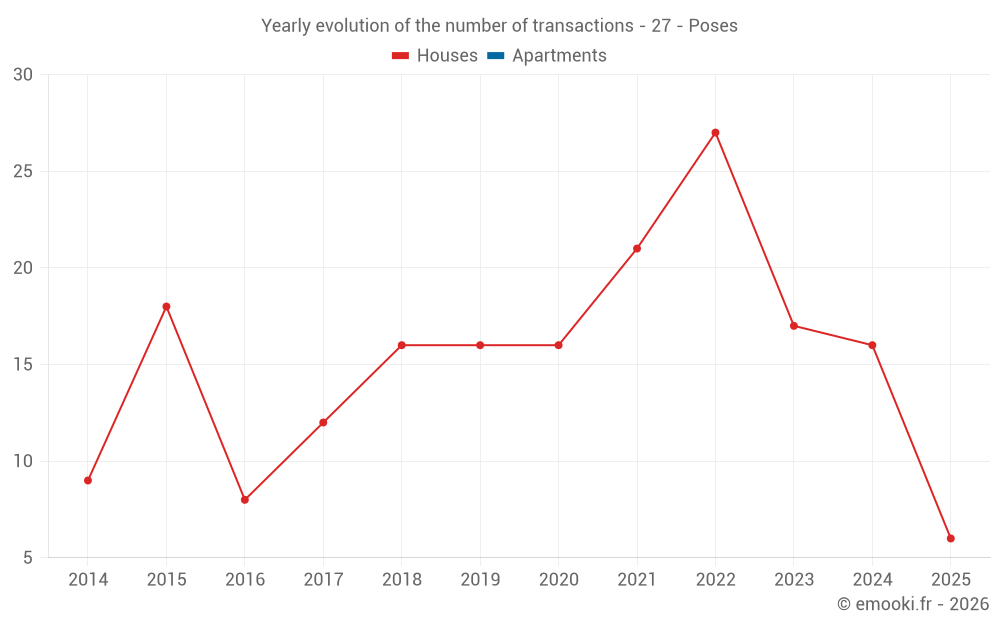 The median price on the 35 house transactions of the last 24 months in the municipality of Poses was 2 188 € per square meter for a median property value of 185 000 €. Over this period, 60% of transactions were between 1 511 and 3 174 € per square meter (from the 2nd to the 8th deciles).