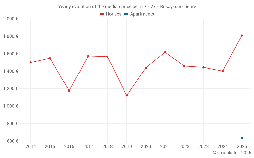 The median price on the 15 house transactions of the last 24 months in the municipality of Rosay-sur-Lieure was 1 532 € per square meter for a median property value of 140 000 €. Over this period, 60% of transactions were between 1 042 and 1 811 € per square meter (from the 2nd to the 8th deciles).