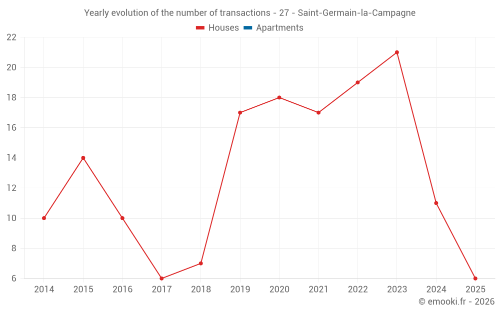 The median price on the 28 house transactions of the last 24 months in the municipality of Saint-Germain-la-Campagne was 1 699 € per square meter for a median property value of 155 675 €. Over this period, 60% of transactions were between 1 279 and 2 247 € per square meter (from the 2nd to the 8th deciles).