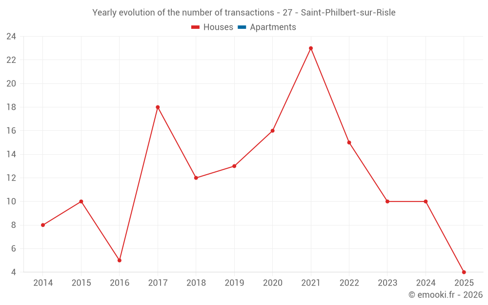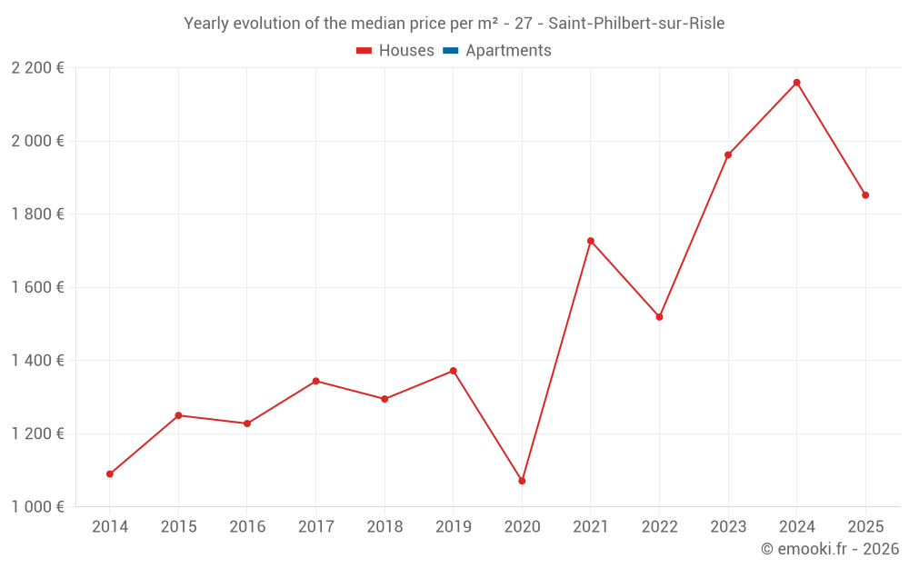The median price on the 20 house transactions of the last 24 months in the municipality of Saint-Philbert-sur-Risle was 1 912 € per square meter for a median property value of 146 950 €. Over this period, 60% of transactions were between 1 149 and 2 434 € per square meter (from the 2nd to the 8th deciles).