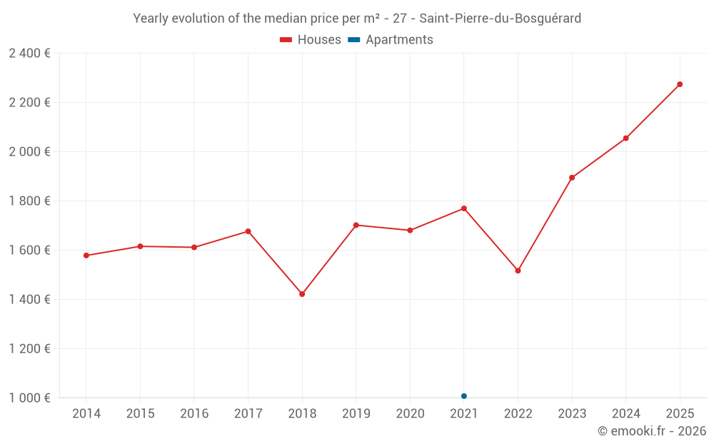 The median price on the 17 house transactions of the last 24 months in the municipality of Saint-Pierre-du-Bosguérard was 2 112 € per square meter for a median property value of 221 000 €. Over this period, 60% of transactions were between 1 598 and 2 495 € per square meter (from the 2nd to the 8th deciles).