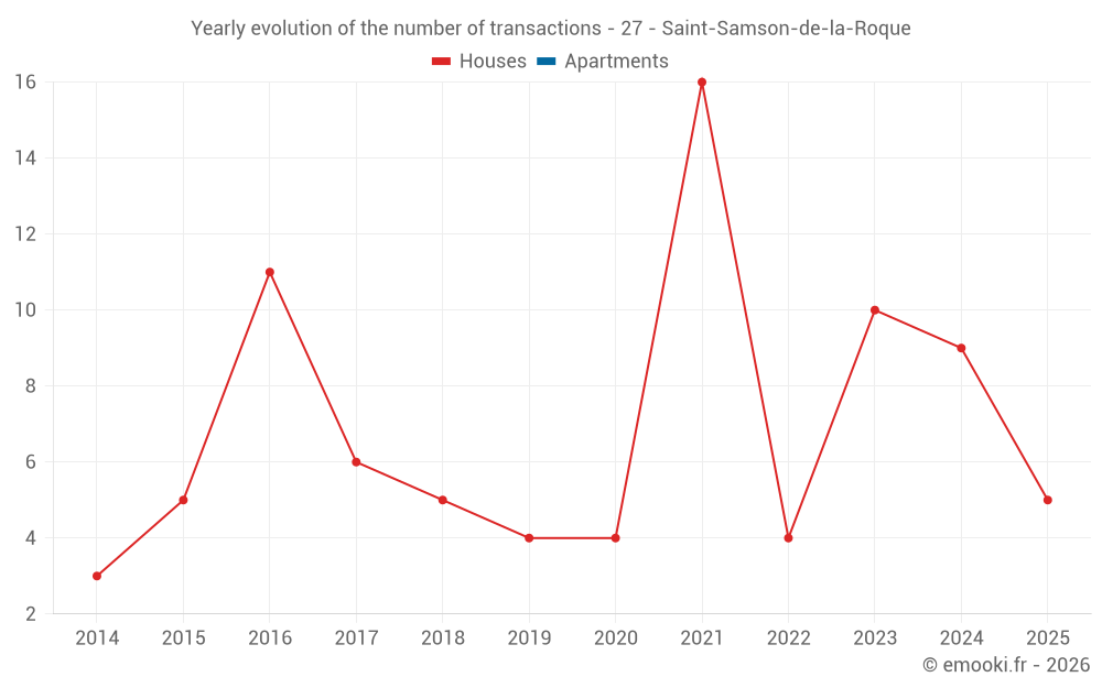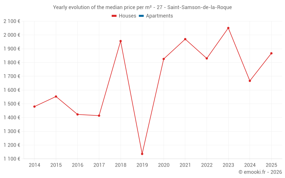 The median price on the 18 house transactions of the last 24 months in the municipality of Saint-Samson-de-la-Roque was 1 767 € per square meter for a median property value of 174 000 €. Over this period, 60% of transactions were between 1 374 and 2 706 € per square meter (from the 2nd to the 8th deciles).