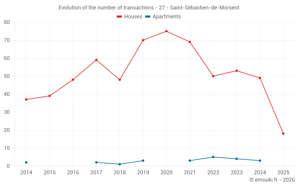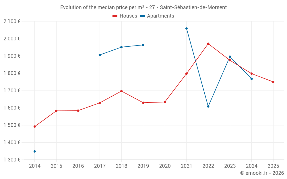 The median price on the 18 house transactions of the last 6 months in the municipality of Saint-Sébastien-de-Morsent was 1 750 € per square meter for a median property value of 183 975 €. Over this period, 60% of transactions were between 1 560 and 1 907 € per square meter (from the 2nd to the 8th deciles).