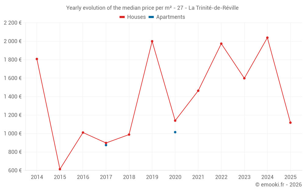 The price per m² of houses has decreased by 45% since 1 year, but it has increased by 24% in 8 years.