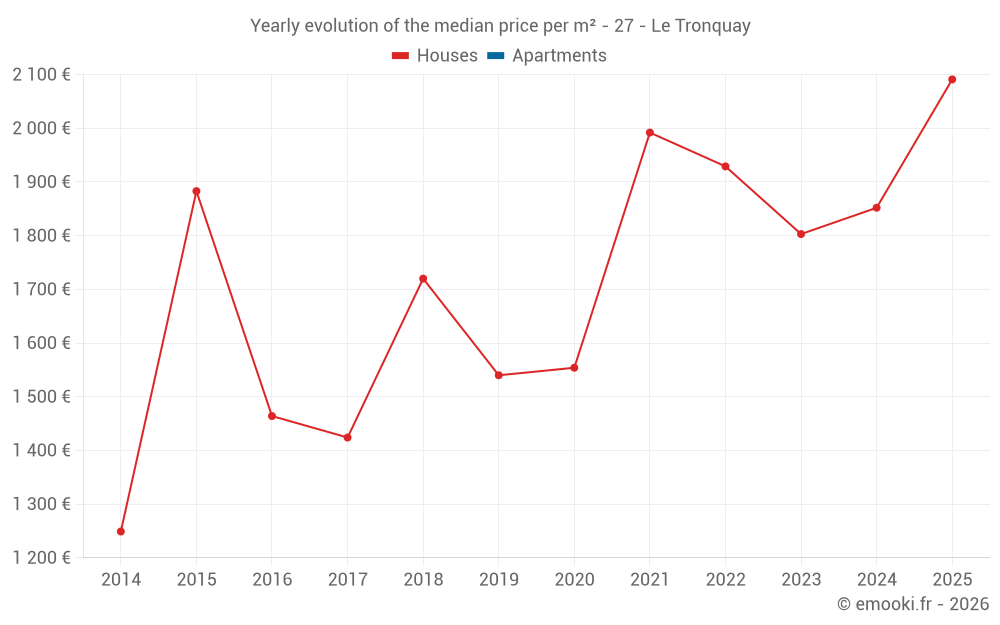 The median price on the 15 house transactions of the last 24 months in the municipality of Le Tronquay was 1 879 € per square meter for a median property value of 186 100 €. Over this period, 60% of transactions were between 1 576 and 2 301 € per square meter (from the 2nd to the 8th deciles).