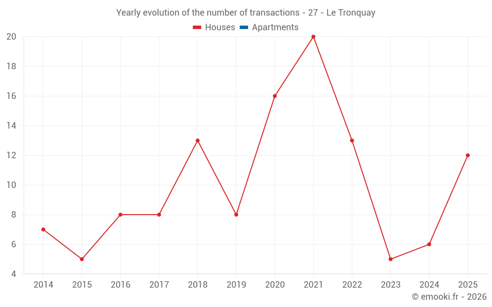 The median price on the 18 house transactions of the last 24 months in the municipality of Le Tronquay was 1 922 € per square meter for a median property value of 198 250 €. Over this period, 60% of transactions were between 1 542 and 2 393 € per square meter (from the 2nd to the 8th deciles).