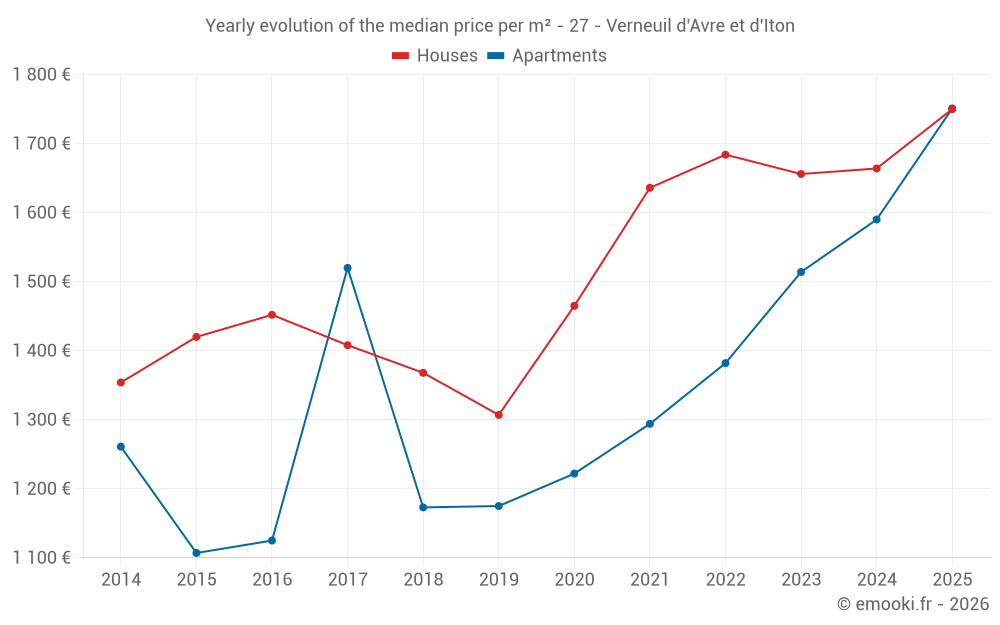 The median price on the 24 apartment transactions of the last 12 months in the municipality of Verneuil d'Avre et d'Iton was 1 778 € per square meter for a median property value of 100 900 €. Over this period, 60% of transactions were between 1 203 and 2 176 € per square meter (from the 2nd to the 8th deciles).