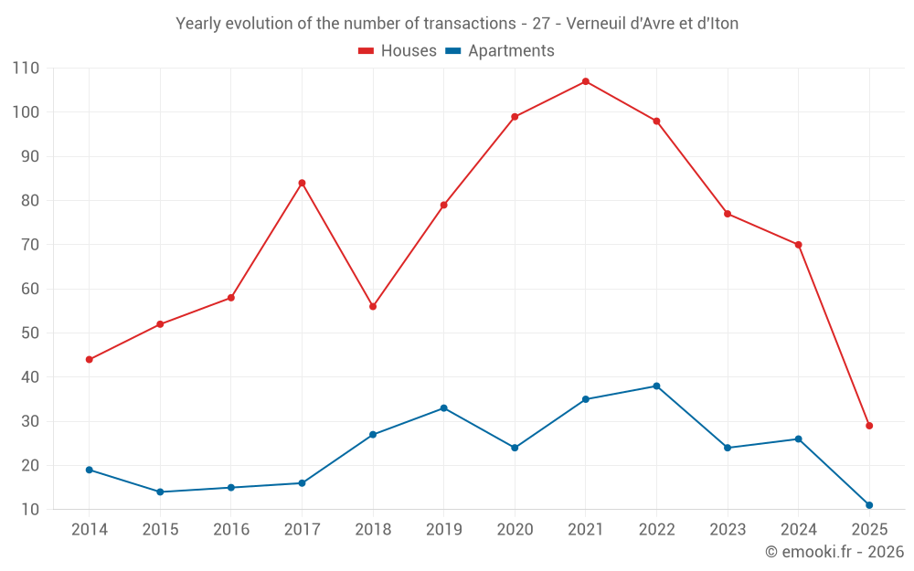 The median price on the 29 house transactions of the last 6 months in the municipality of Verneuil d'Avre et d'Iton was 1 750 € per square meter for a median property value of 145 000 €. Over this period, 60% of transactions were between 1 323 and 1 992 € per square meter (from the 2nd to the 8th deciles).