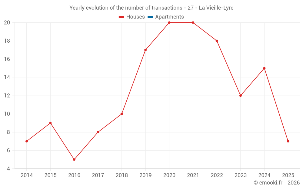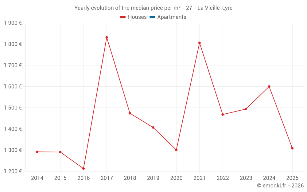 The median price on the 31 house transactions of the last 24 months in the municipality of La Vieille-Lyre was 1 484 € per square meter for a median property value of 123 500 €. Over this period, 60% of transactions were between 1 000 and 1 843 € per square meter (from the 2nd to the 8th deciles).