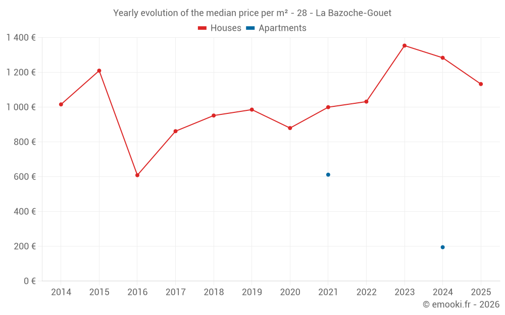 The median price on the 39 house transactions of the last 24 months in the municipality of La Bazoche-Gouet was 1 188 € per square meter for a median property value of 98 500 €. Over this period, 60% of transactions were between 606 and 1 569 € per square meter (from the 2nd to the 8th deciles).