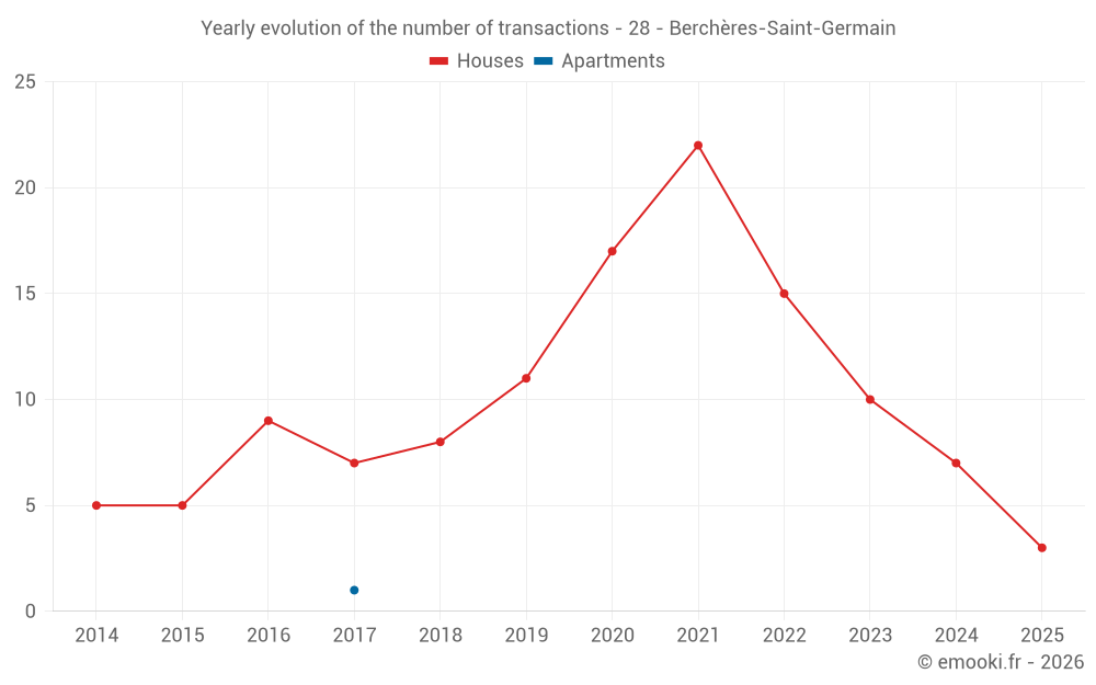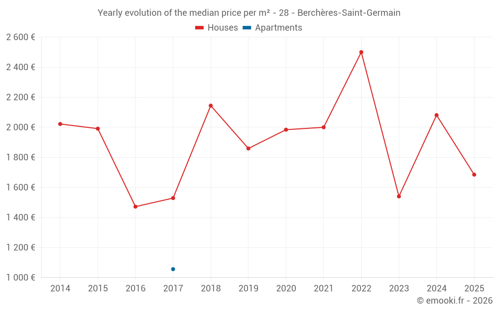 The median price on the 14 house transactions of the last 24 months in the municipality of Berchères-Saint-Germain was 1 934 € per square meter for a median property value of 194 500 €. Over this period, 60% of transactions were between 1 138 and 2 180 € per square meter (from the 2nd to the 8th deciles).