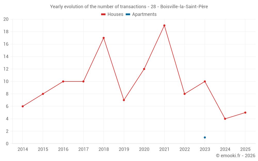 The median price on the 15 house transactions of the last 24 months in the municipality of Boisville-la-Saint-Père was 1 279 € per square meter for a median property value of 157 110 €. Over this period, 60% of transactions were between 632 and 2 415 € per square meter (from the 2nd to the 8th deciles).