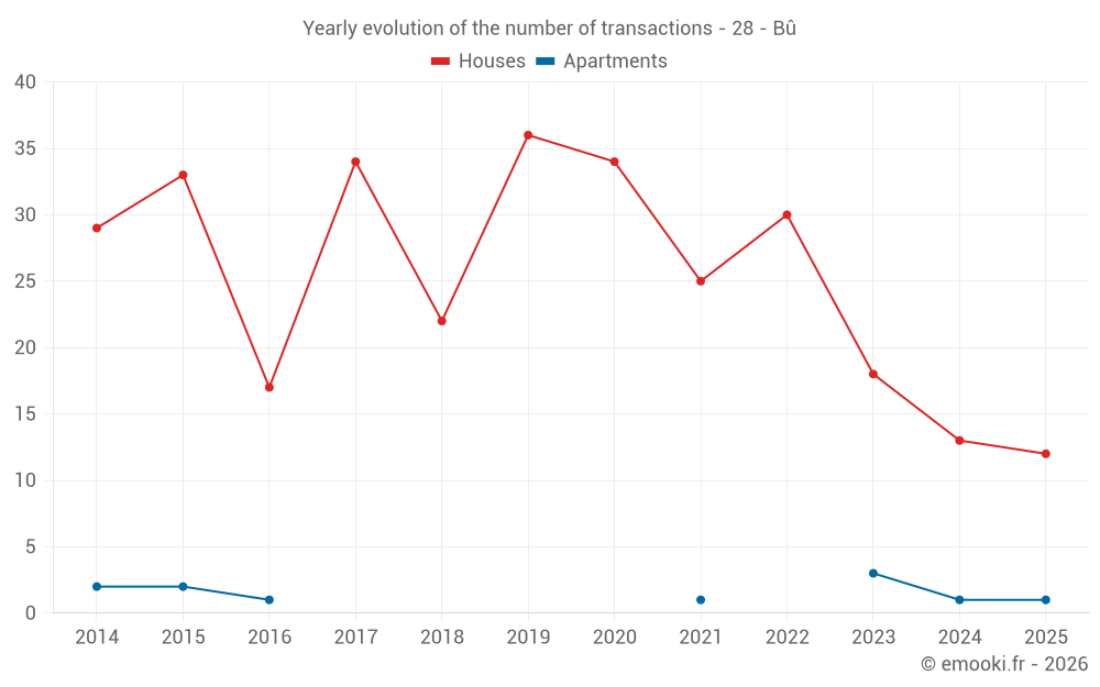 The median price on the 18 house transactions of the last 12 months in the municipality of Bû was 2 270 € per square meter for a median property value of 253 750 €. Over this period, 60% of transactions were between 1 884 and 2 885 € per square meter (from the 2nd to the 8th deciles).