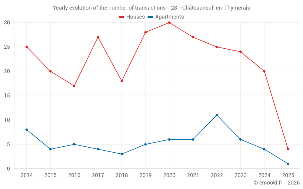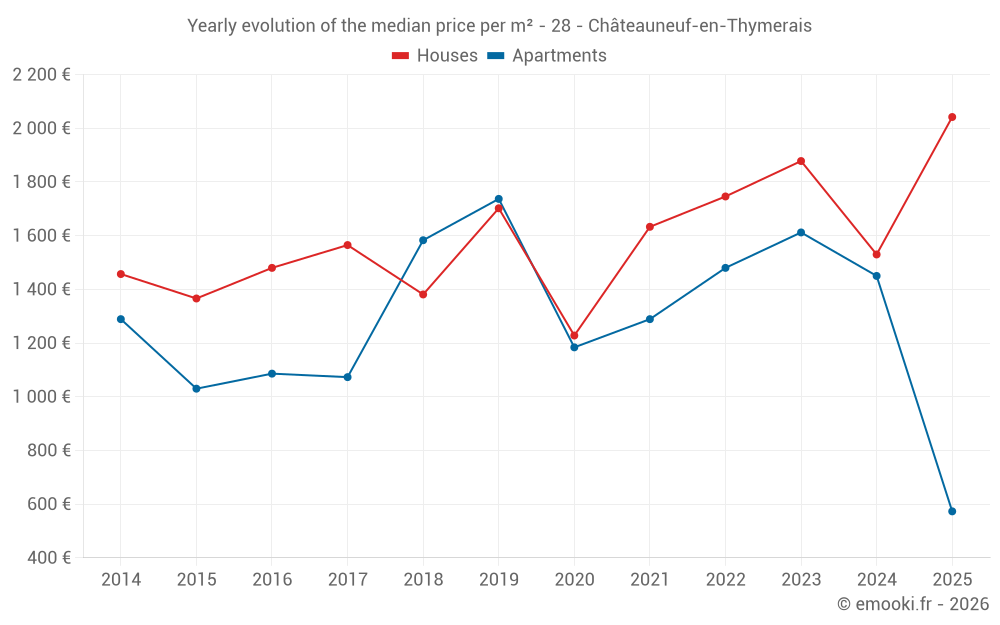 The median price on the 16 house transactions of the last 12 months in the municipality of Châteauneuf-en-Thymerais was 1 734 € per square meter for a median property value of 170 000 €. Over this period, 60% of transactions were between 1 320 and 1 963 € per square meter (from the 2nd to the 8th deciles).