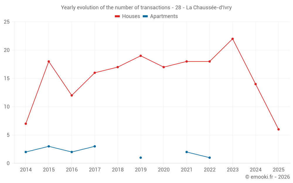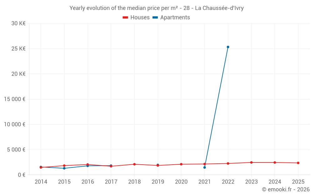 The median price on the 32 house transactions of the last 24 months in the municipality of La Chaussée-d'Ivry was 2 460 € per square meter for a median property value of 200 000 €. Over this period, 60% of transactions were between 1 955 and 2 964 € per square meter (from the 2nd to the 8th deciles).