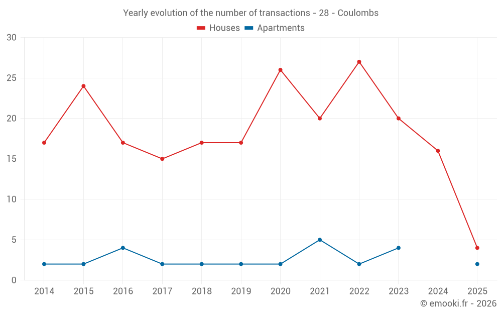 The median price on the 29 house transactions of the last 24 months in the municipality of Coulombs was 2 196 € per square meter for a median property value of 186 000 €. Over this period, 60% of transactions were between 1 446 and 2 519 € per square meter (from the 2nd to the 8th deciles).